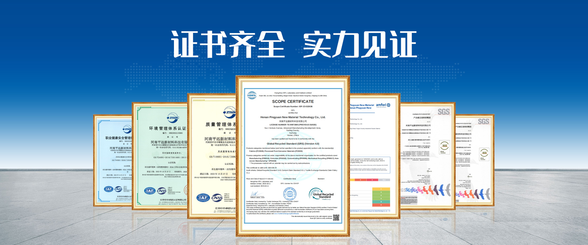 河南平遠新材料科技有限公司已通過ISO9001質量體系、14001環(huán)境體系、45001職業(yè)健康安全管理體系認證;GRS全球回收標準認證;美國UL OBP 2809趨海塑料認證;BSCI商業(yè)社會標準認證;LCA生命周期認證。